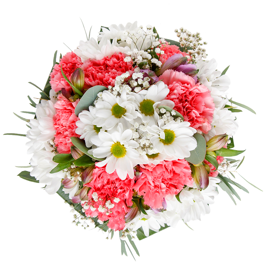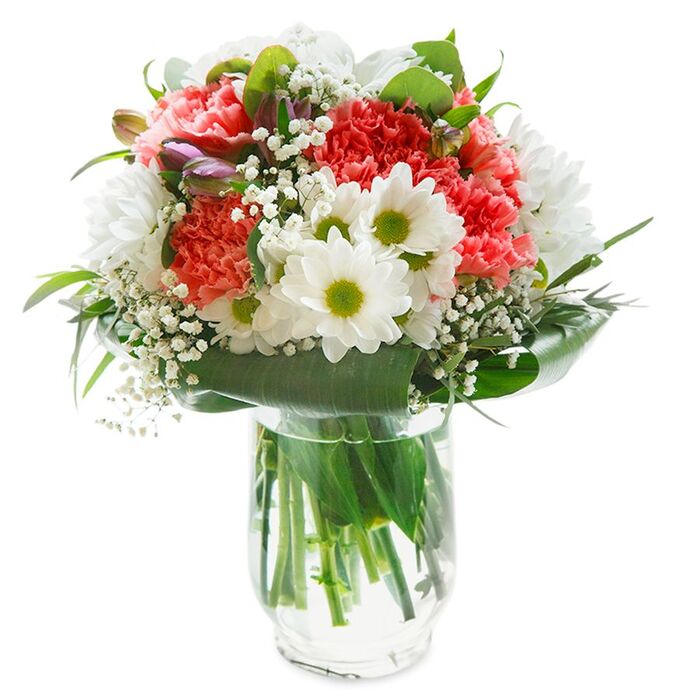 Bursting with fresh colour and the simple happiness that defines Shacklewell's local charm, this bouquet is nestled in a bright white gift bag, awaiting a journey along Shacklewell Lane to bring cheer to its recipient. Ruffled coral and soft peach carnations bring a gentle vibrancy reminiscent of early summer blooms, each petal offering a whisper of soft fragrance and plush, velvety touch. Sprightly white daisies with zesty green-yellow hearts add a dose of brightness-joyful and crisp, like the first flowers of spring cropping up in neighbourhood gardens. Airy clusters of white gypsophila dance among the larger blossoms, infusing the arrangement with a dreamy, cloud-like softness. Unfolding at the bouquet's base, glossy green leaves cradle every bloom, their shine and fullness creating a frame as inviting as any found on a walk through Hackney's lush community parks. A few unopened, purple-edged buds peek out, weaving in a sense of wonder and anticipation. Illuminated against a pure white background, each detail shines with clarity that only professional, passionate florists can provide. This bouquet radiates sincere affection and celebration-the ideal, ready-to-deliver gift for a birthday, anniversary, or simply to brighten the day of a friend nearby, carefully arranged for delivery across Shacklewell with all the artistry of a true local expert. This bouquet is a celebration of Shacklewell's gentle radiance, celebrated in the language of locally inspired blooms. At its centre, cheerful white daisies with lime-tinged eyes gather sunlight among clouds of ruffled coral-pink carnations, their texture fluttering like spring breezes through Clissold Park. Gypsophila, almost star-like, dances over the bouquet's surface, lending it a dreamy, weightless quality that softens every edge. Blush-tinted alstroemeria buds and slender eucalyptus leaves tuck between larger blossoms, adding subtle fragrance and tonal harmony shaped by the area's community gardens. The palette is bright and restorative, capturing the spirit of joyful renewal that marks life's special events-congratulations, birthdays, or simple moments when you wish to mark an occasion with beauty. Each element is intentionally selected and thoughtfully placed, embodying a dedication to hand-crafted arrangement that characterises Shacklewell's own creative energy. The result is an exuberant yet tranquil bouquet-fresh, uplifting, and expertly crafted for delivery throughout Shacklewell, whether destined for a dinner table, office, or someone's arms as a warm, floral embrace. This bouquet feels like the essence of a sunny morning in Shacklewell-radiant, uplifting, and effortlessly styled to delight. At its lively centre, coral-pink carnations bloom in soft, textured clusters, their ruffled petals brimming with movement and warmth, recalling the gentle energy of Ridley Road Market in spring. Crisp white daisies with distinct green-yellow centres open wide around them, catching the eye like tiny bursts of joy. Sprays of delicate baby's breath weave between the bold flowers, creating feathery layers that bring a dreamy softness. Sleek, deep green leaves-both broad and slender-cradle the entire arrangement, grounding it with a sense of calm and harmony that echoes through local Hackney parks. Everything is arranged in a simple, crystal-clear vase filled with fresh water, where the structure of green stems is visible and celebrated. Against a spotless white background, the bouquet's palette of coral, white, and fresh green practically glows, each bloom illuminated to showcase its individual beauty. Every detail has been placed with intention by skilled Shacklewell florists, making this arrangement a heartfelt gesture-beautiful for a birthday, a celebration of new beginnings, or simply as a bright, comforting presence in a cherished home.
